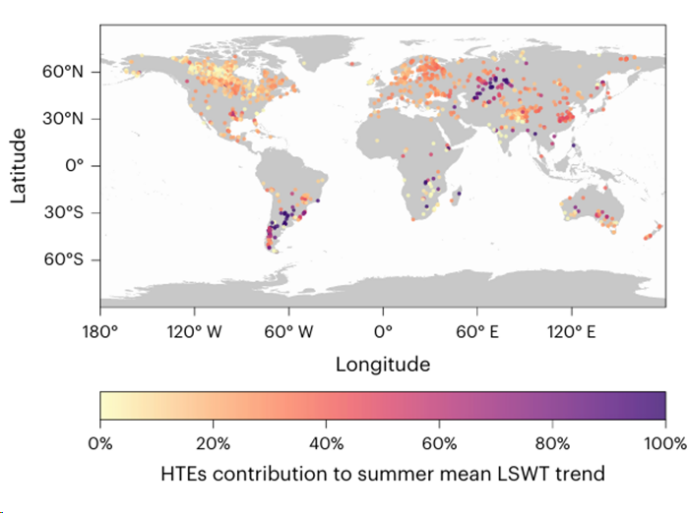 Freshwater lakes are critical ecosystems that regulate regional climates, support biodiversity, and provide essential resources for human societies. However, as global warming accelerates, extreme heatwaves are increasingly hitting lakes.Published in Communications Earth & Environment, a new international study led by the Nanjing Institute of Geography and Limnology, Chinese Academy of Sciences (NIGLAS) has revealed that lake heatwaves are generally more intense, longer-lasting, and more frequent than their atmospheric counterparts.The study analyzed daily surface-water and near-surface air temperatures from 265 lakes worldwide (2000–2022) to compare heatwave trends, spatial patterns, and underlying drivers in lakes versus the overlying atmosphere.The researchers found that when lake and atmospheric heatwaves coincide, the resulting coupled events become substantially more extreme, exposing freshwater ecosystems to prolonged and amplified heat stress. Composite metrics that combine intensity and duration further demonstrate that lakes accumulate more cumulative thermal exposure than the atmosphere above.The team identified key environmental factors intensifying these differences.“In addition to temperature, decline in wind speed can significantly exacerbate lake heat extremes. Wind should therefore be treated as one of the important drivers in forecasting and adapting to lake heatwaves.” said the first author Yifan Yang. Weaker winds suppress turbulent mixing and evaporative cooling, enhance thermal stratification, and allow surface waters to warm more rapidly and retain heat longer.Spatially, geographic location was the dominant determinant of lake–air contrasts, followed by lake size and depth.Temporal dynamics also revealed distinct patterns. During coupled lake–atmosphere heatwaves, lake heatwaves begin earlier and persist longer, extending biological exposure windows and increasing ecological risk.Projections under future emissions scenarios indicate that the gap between lake and air heatwaves may narrow by the end of the century, as atmospheric temperatures are expected to rise faster than surface water temperatures.“Freshwater systems experience longer and more cumulative heat stress than the atmosphere alone, this discrepancy is not trivial, it's a signal for action, more attention should be paid to the impact of heatwaves on lakes.” said the study's corresponding author Jianming Deng. “Our study provides a foundation for improved forecasting and for the development of effective freshwater-ecosystem adaptation strategies.”